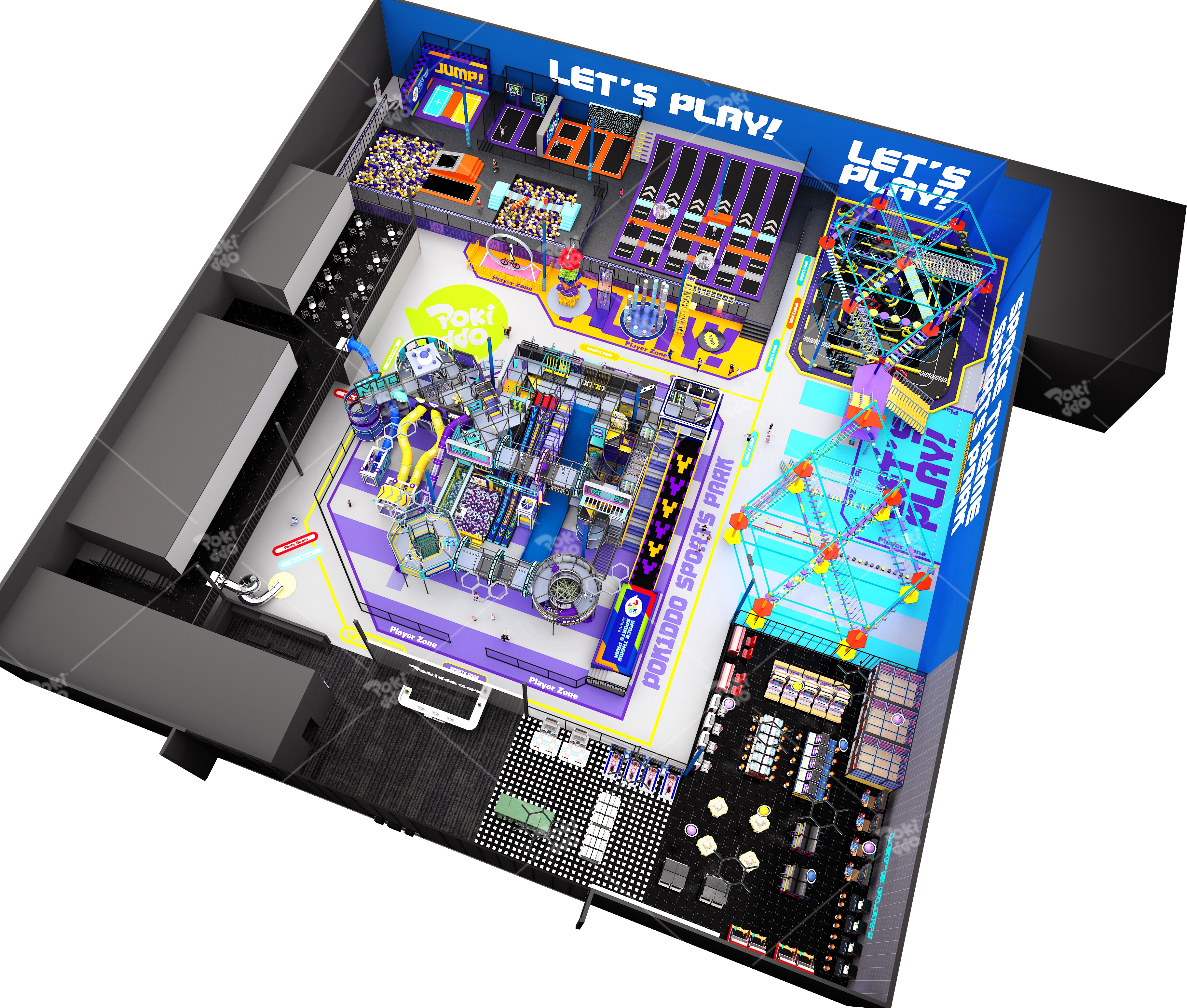 We divided the project space into five main functional zones: Trampoline Zone, Adventure Zone, Climbing Zone, Soft Play Castle Zone, and Leisure & Support Zone. This zoning not only enriches the visitor experience but also facilitates differentiated pricing strategies and targeted management. In particular, the design of 10 party rooms directly addresses the strong local demand for children’s birthday parties and group events, becoming a “stabilizer” for weekend revenue.