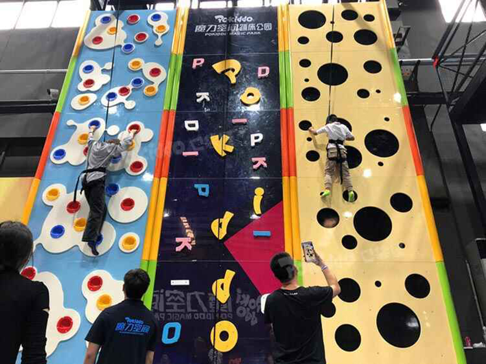 The art rock climbing wall features vibrant colors and diverse shapes. Our venue boasts a unique design with clouds, cheese, and the Pokiddo logo. Standing at nearly 8 meters tall, it offers an incredibly challenging and thrilling experience!